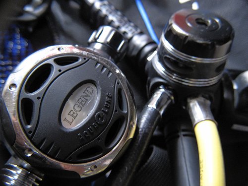 2003年夏に購入した器材、そろそろ8年になります。1stステージもレギュレーターも傷だらけです。インフレーターホースをつけてみたりしてチェックします。圧縮タンクがないのでそれ以上なにもできないのが嫌ですね。