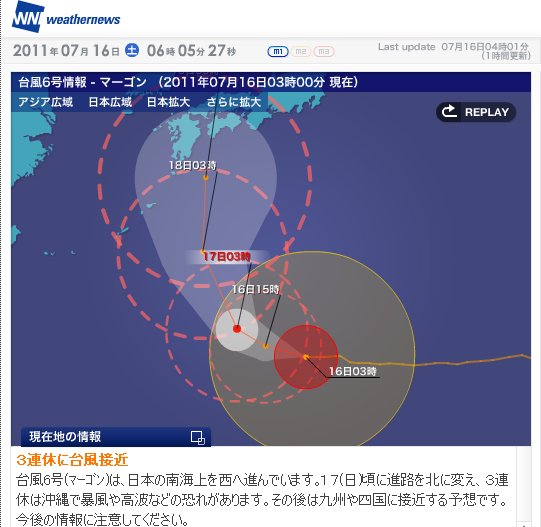 マーゴンと海の日三連休 海日記・戯言 2011.07.16 マーゴンがきています。太平洋側の海レジャーには充分ご注意ください。 三連休を見事にかすめて台風マーゴンは日本本土へと北上します。めぐみの雨である一方、旅行者泣かせですね。 日記が気に入ったら文字をクリック★にほんブログ村 長野(市)情報へ