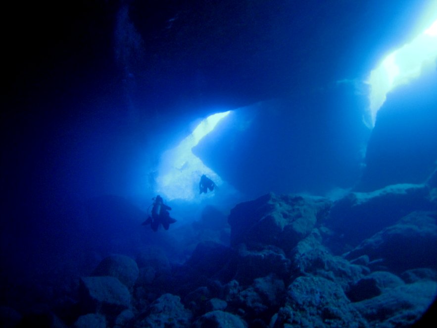 いざエントリすると3つの外洋に繋がる穴がダイバーを迎えてくれます。こんな感じで。前のチームは、真ん中の穴から出るみたいですな。