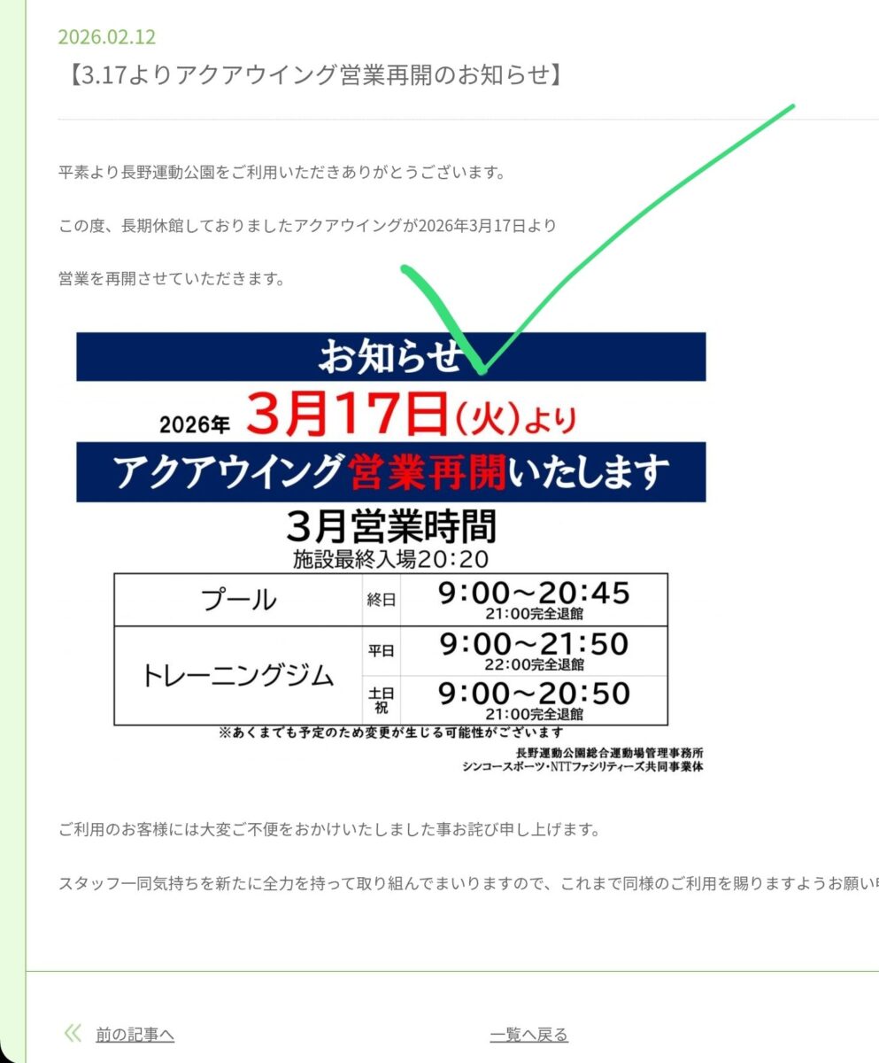 アクアウイング https://www.aqua-wing.jp/ のニュースにて、2026年3月17日よりプール利用再開すると掲示がありました🏊‍♂️